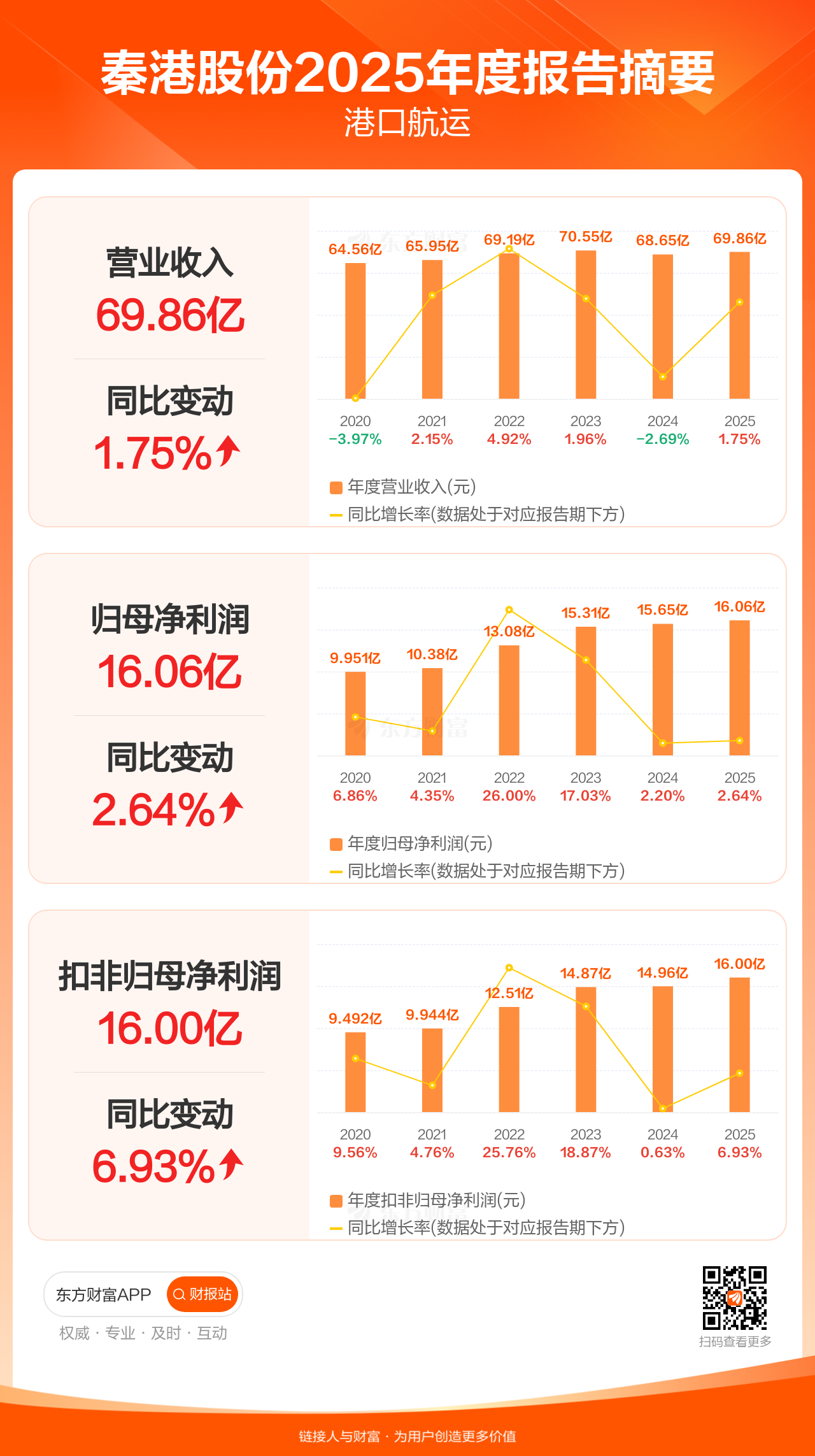 秦港股份3月28日发布2025年年报显示,公司全年实现营业收入69.86亿元,同比增长1.75%;归母净利润16.06亿元,同比增长2.64%;扣非归母净利润16.00亿元,同比增长6.93%。