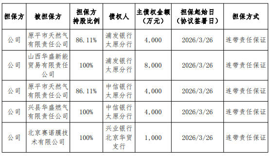 上证报中国证券网讯天壕能源3月27日盘后发布公告披露为子公司提供担保的进展。公告显示,3月26日,公司分别为控股子公司原平市天然气有限责任公司、全资子公司山西华盛新能贸易有限责任公司、全资子公司兴县华盛燃气有限责任公司、全资子公司北京赛诺膜技术有限公司向相关银行申请的融资额度提供连带责任保证担保。具体请见下表: