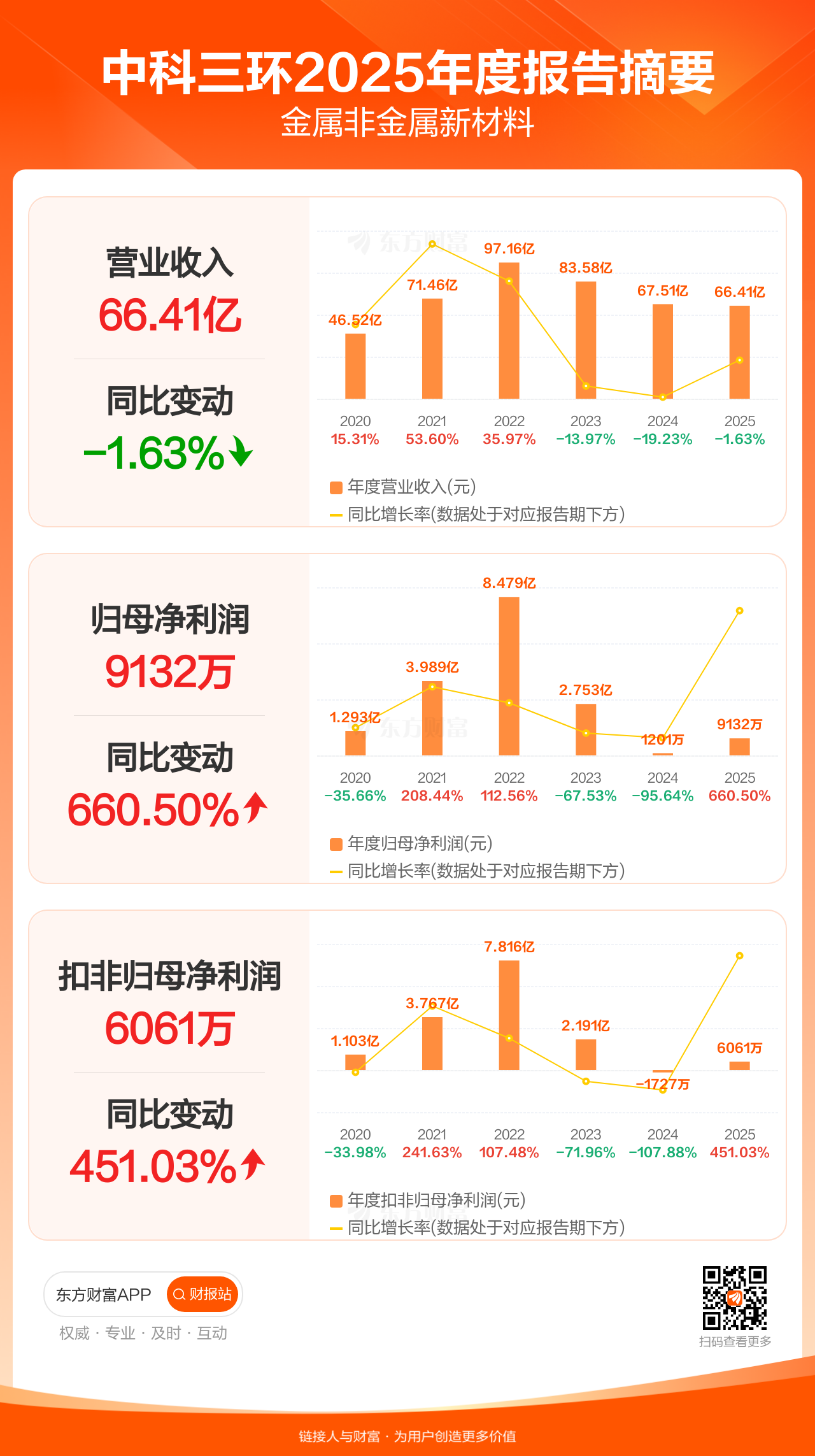中科三环3月28日发布2025年年报显示,公司全年实现营业收入66.41亿元,同比下滑1.63%;归母净利润9131.86万元,同比增长660.50%;扣非归母净利润6060.65万元,同比增长451.03%。