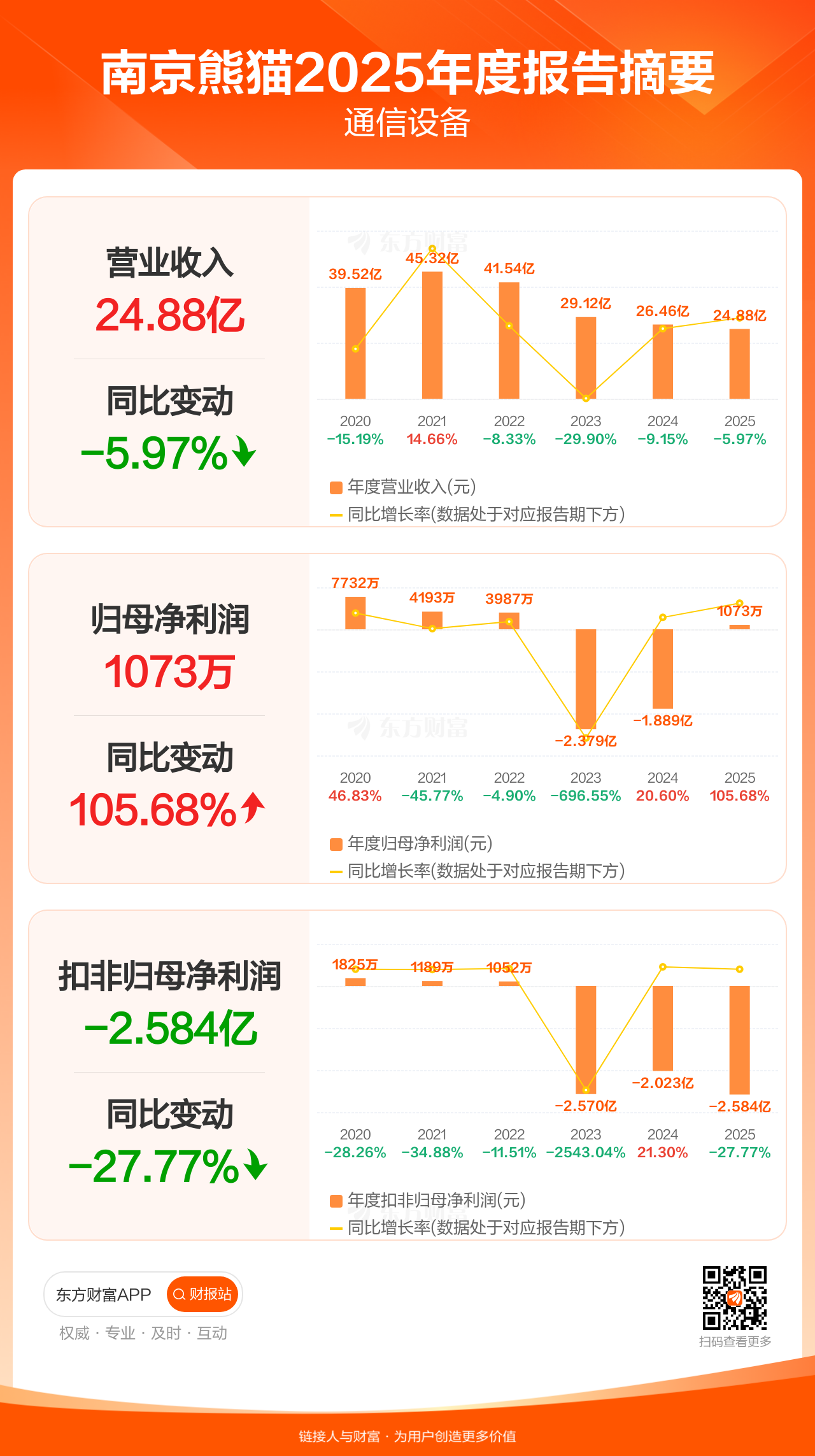 南京熊猫3月28日发布2025年年报显示,公司全年实现营业收入24.88亿元,同比下滑5.97%;归母净利润1073.17万元,同比增长105.68%;扣非归母净利润-2.58亿元。