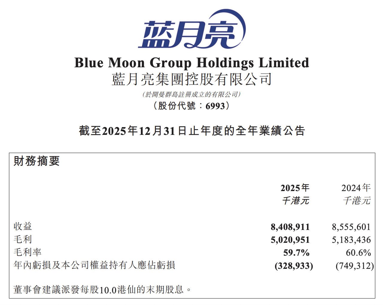 日前蓝月亮集团(06993.HK)发布2025年全年业绩公告。公告显示,截至2025年12月31日,公司实现收益约84.09亿港元,较上年同期的85.56亿港元略微下滑,年内亏损及公司权益持有人应占亏损约3.29亿港元,上年同期亏损7.49亿港元。毛利率自2024年的60.6%跌至59.7%。