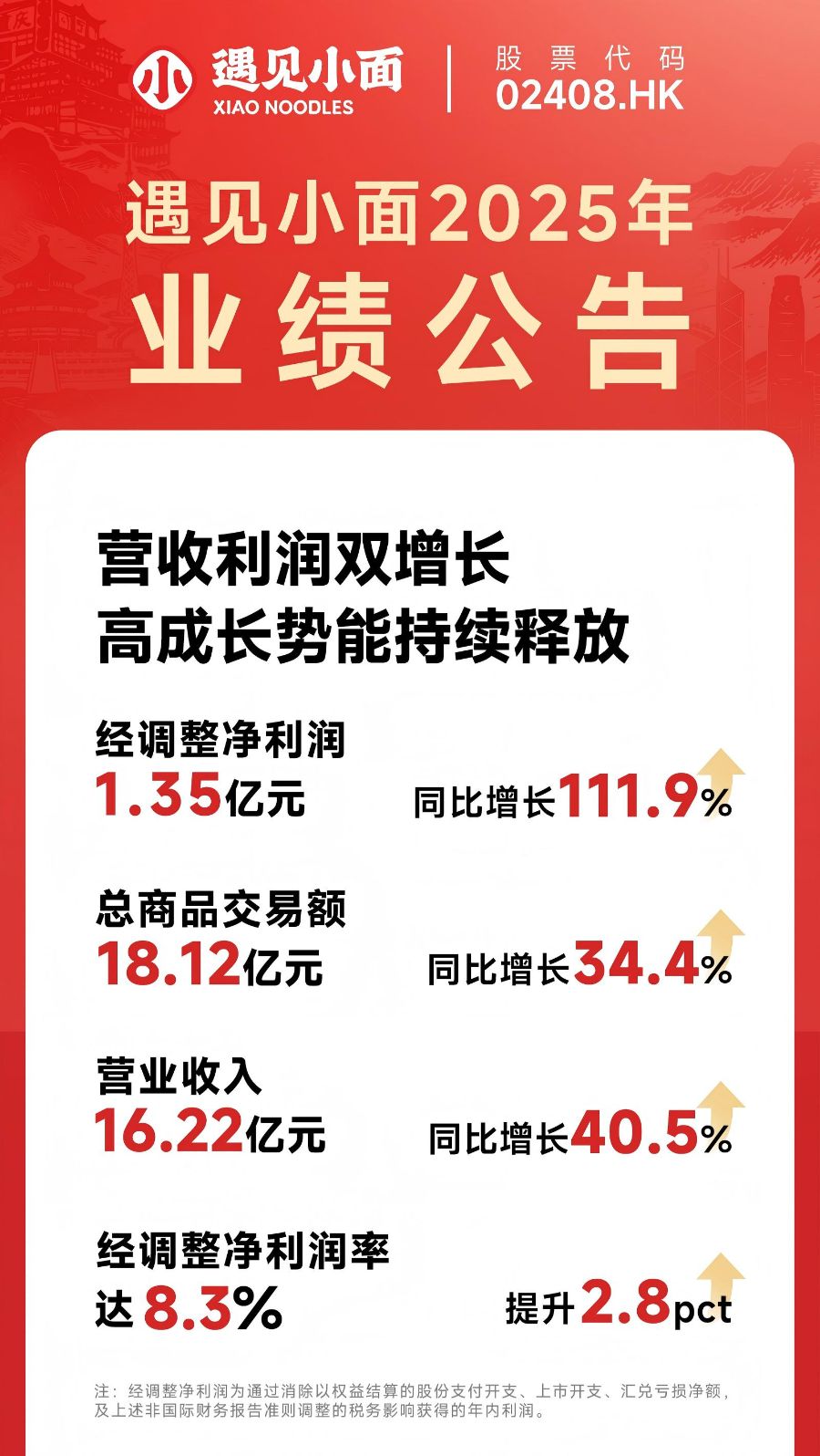 3月27日,据悉,广州遇见小面餐饮股份有限公司(股票代码:2408.HK,下称“公司”)上市后首份年度业绩公告出炉。公告显示,2025年遇见小面营业收入达16.22亿元人民币,同比增长40.5%,经调整净利润达1.35亿元人民币,同比增长111.9%,经调整净利润率达8.3%。