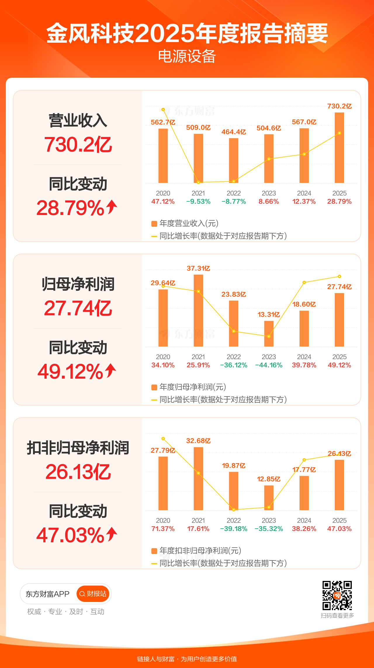 金风科技3月28日发布2025年年报显示,公司全年实现营业收入730.23亿元,同比增长28.79%;归母净利润27.74亿元,同比增长49.12%;扣非归母净利润26.13亿元,同比增长47.03%。