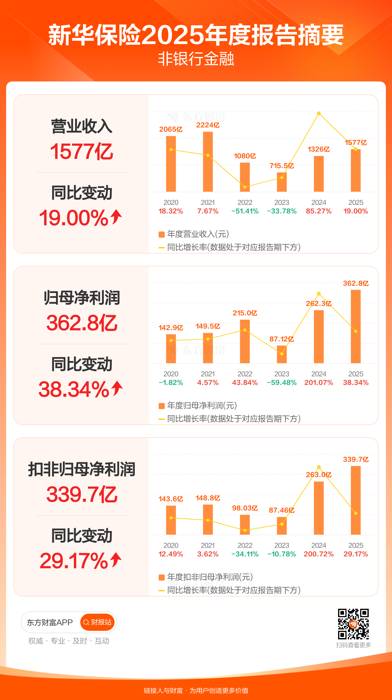 新华保险3月28日发布2025年年报显示,公司全年实现营业收入1577.45亿元,同比增长19.00%;归母净利润362.84亿元,同比增长38.34%;扣非归母净利润339.73亿元,同比增长29.17%。
