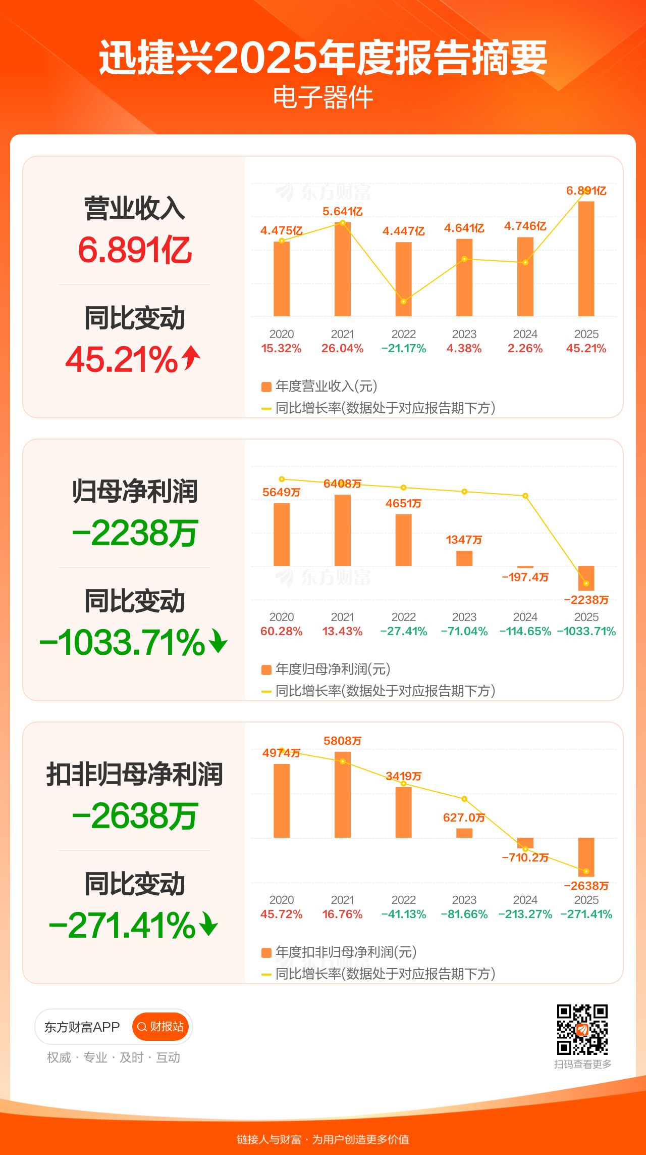 迅捷兴3月28日发布2025年年报显示,公司全年实现营业收入6.89亿元,同比增长45.21%;归母净利润-2237.90万元;扣非归母净利润-2637.74万元。每股EPS-0.17元,低于机构一致预测的1.12元。