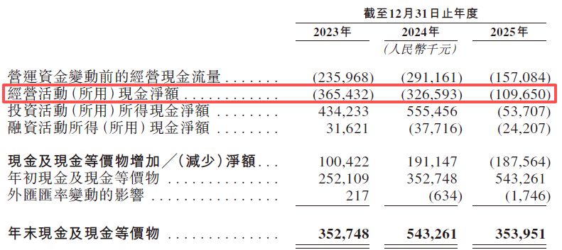 与巨额账面亏损同步出现的,是公司主营业务经营活动现金流的持续承压。报告期内,星环科技经营活动产生的现金流量净额分别为-3.65亿元、-3.27亿元和-1.1亿元,三年间共计净流出8.02亿元资金。
