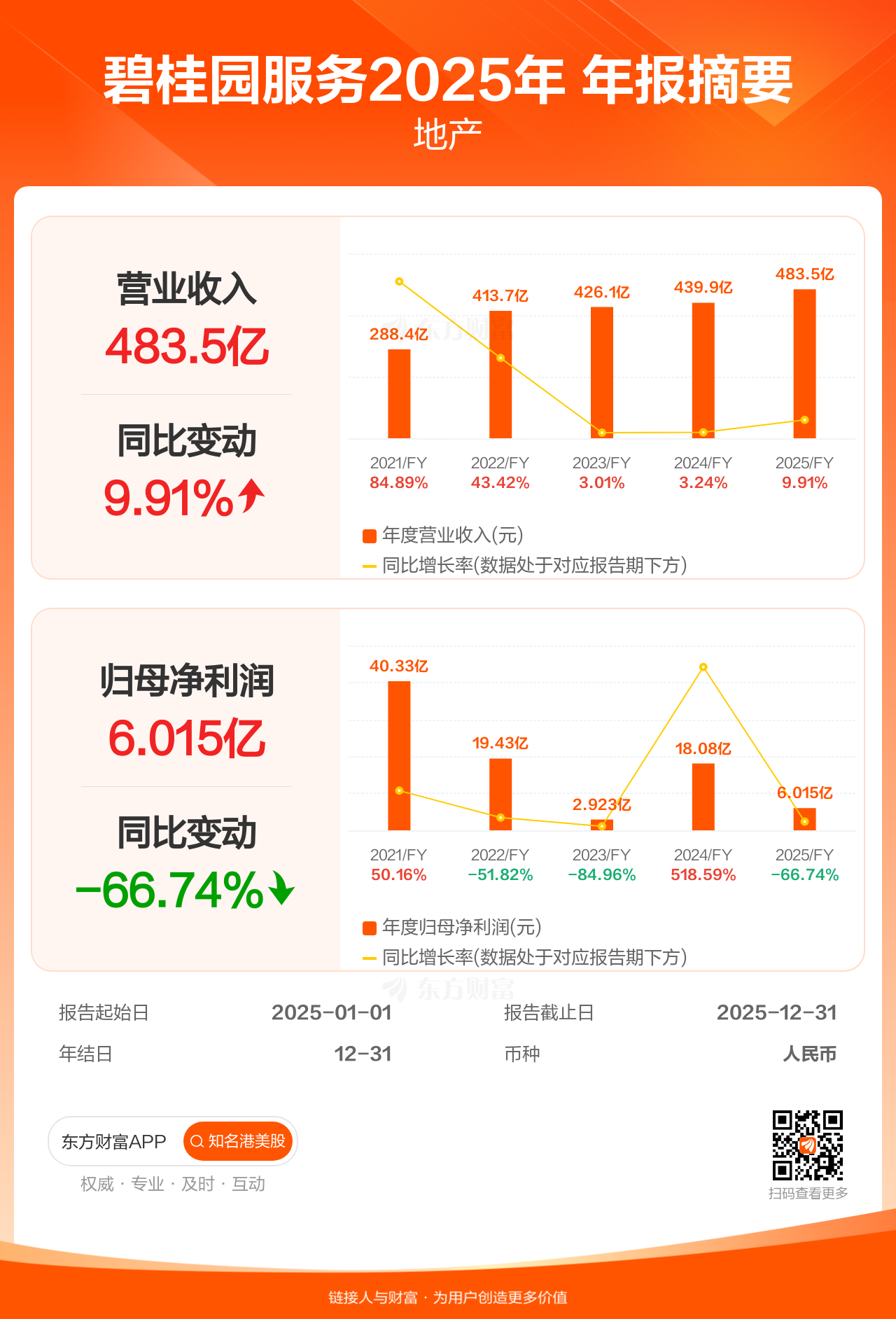 碧桂园服务3月27日发布年报业绩,截至2025年12月31日的12个月内,该公司营业收入483.54亿人民币,同比增长9.91%;公司权益持有人应占溢利(归母净利润)6.01亿人民币,同比减少66.74%,低于机构一致预测的18.00亿人民币。