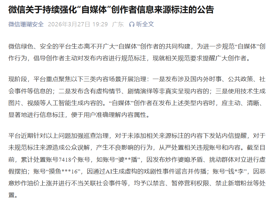 3月27日,据微信珊瑚安全公众号消息,微信发布关于持续强化“自媒体”创作者信息来源标注的公告。