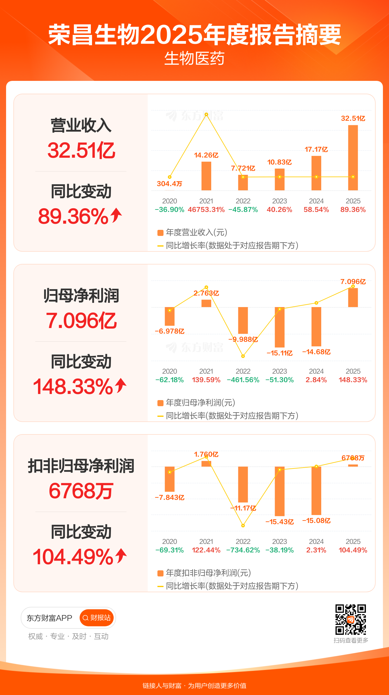 荣昌生物3月28日发布2025年年报显示,公司全年实现营业收入32.51亿元,同比增长89.36%;归母净利润7.10亿元,同比增长148.33%;扣非归母净利润6767.55万元,同比增长104.49%。