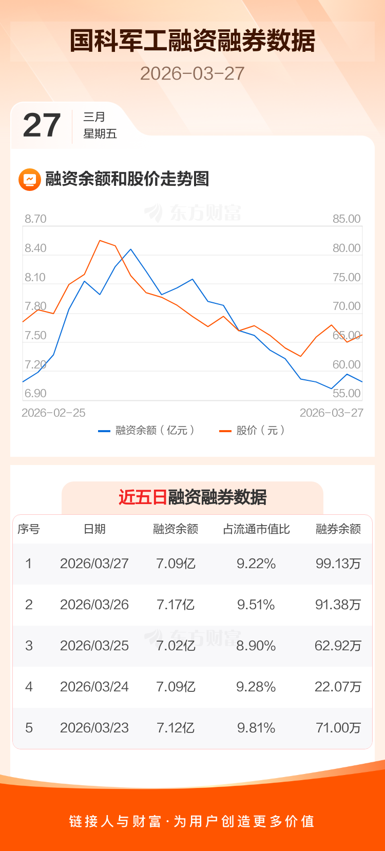 交易所最新数据显示,国科军工于2026年3月27日获融资买入3275.59万元,融资偿还4097.13万元,当日融资净偿还821.54万元。目前,该股融资余额7.09亿,占流通市值比例为9.22%。