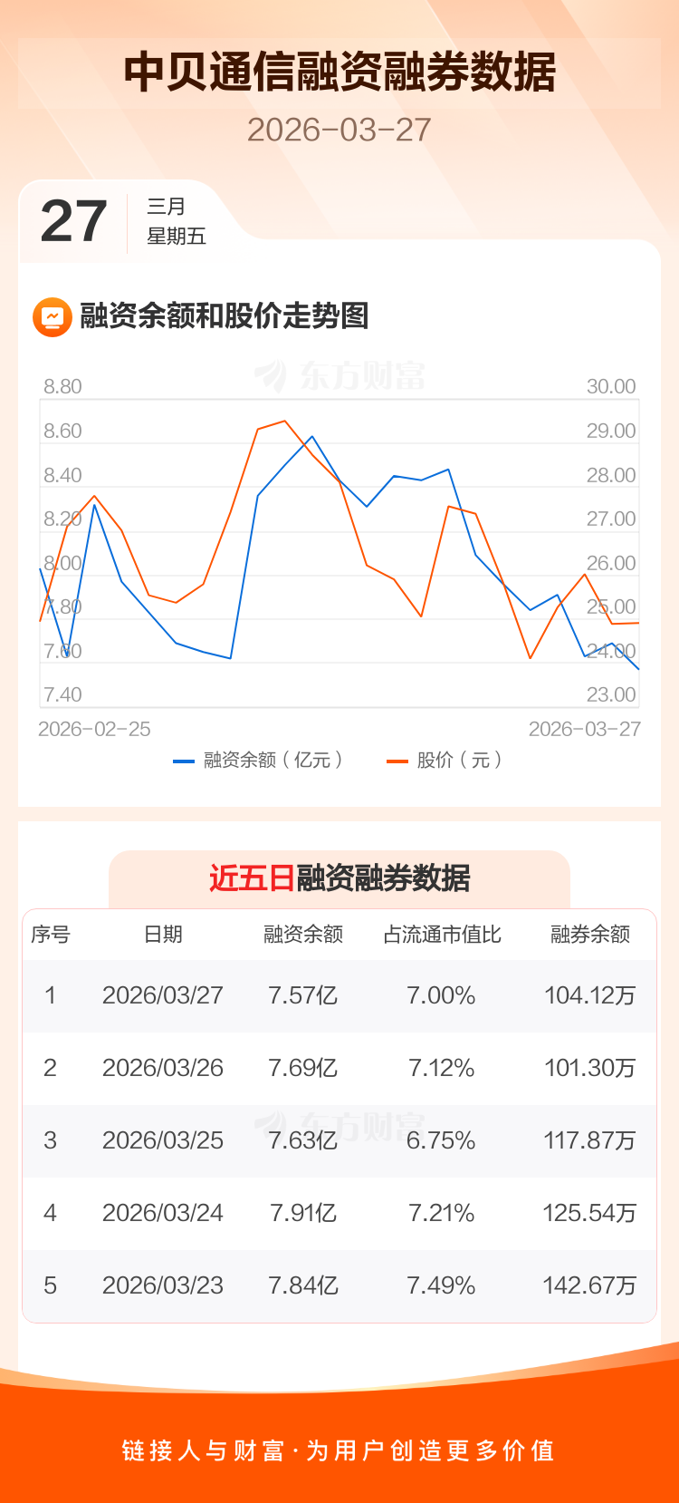 交易所最新数据显示,中贝通信于2026年3月27日获融资买入5096.84万元,融资偿还6341.43万元,当日融资净偿还1244.59万元。目前,该股融资余额7.57亿,占流通市值比例为7.00%。