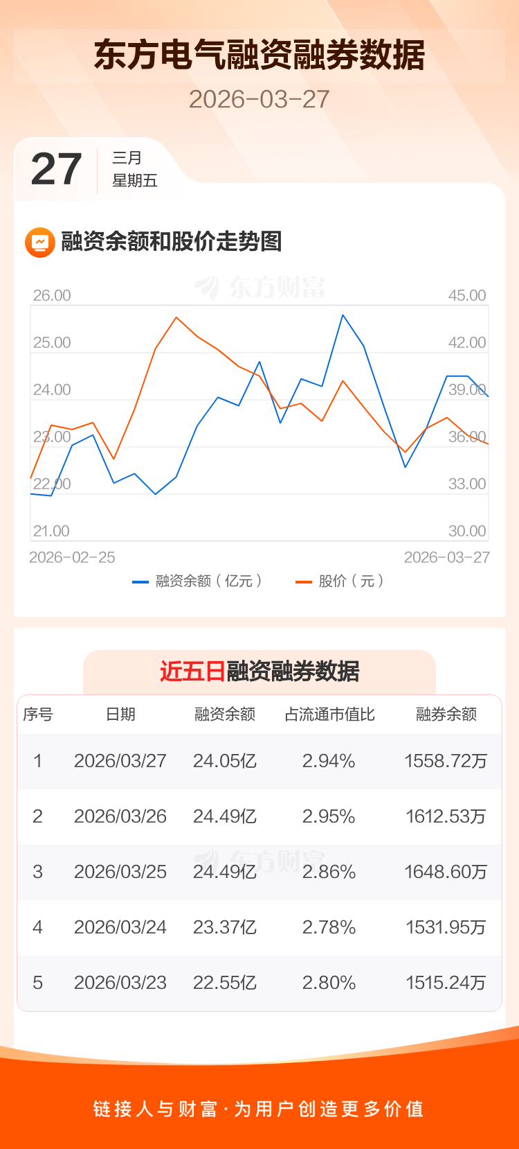 交易所最新数据显示,东方电气于2026年3月27日获融资买入1.52亿元,融资偿还1.95亿元,当日融资净偿还4329.25万元。目前,该股融资余额24.05亿,占流通市值比例为2.94%。