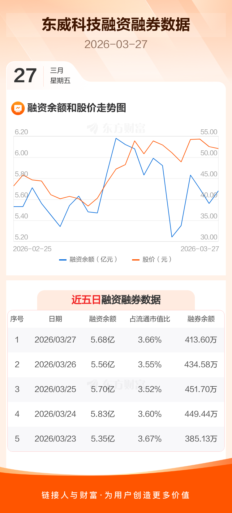 交易所最新数据显示,东威科技于2026年3月27日获融资买入6330.18万元,融资偿还5154.71万元,当日融资净买入1175.46万元。目前,该股融资余额5.68亿,占流通市值比例为3.66%。
