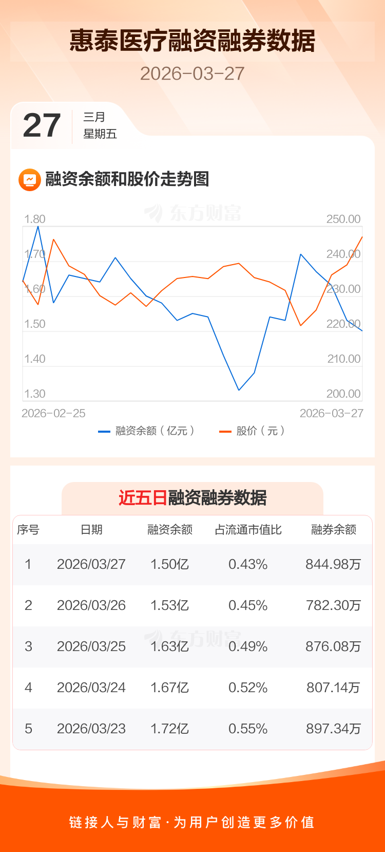 交易所最新数据显示,惠泰医疗于2026年3月27日获融资买入1875.95万元,融资偿还2116.23万元,当日融资净偿还240.28万元。目前,该股融资余额1.50亿,占流通市值比例为0.43%。