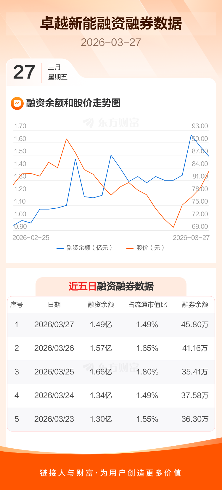 交易所最新数据显示,卓越新能于2026年3月27日获融资买入1486.43万元,融资偿还2307.05万元,当日融资净偿还820.62万元。目前,该股融资余额1.49亿,占流通市值比例为1.49%。