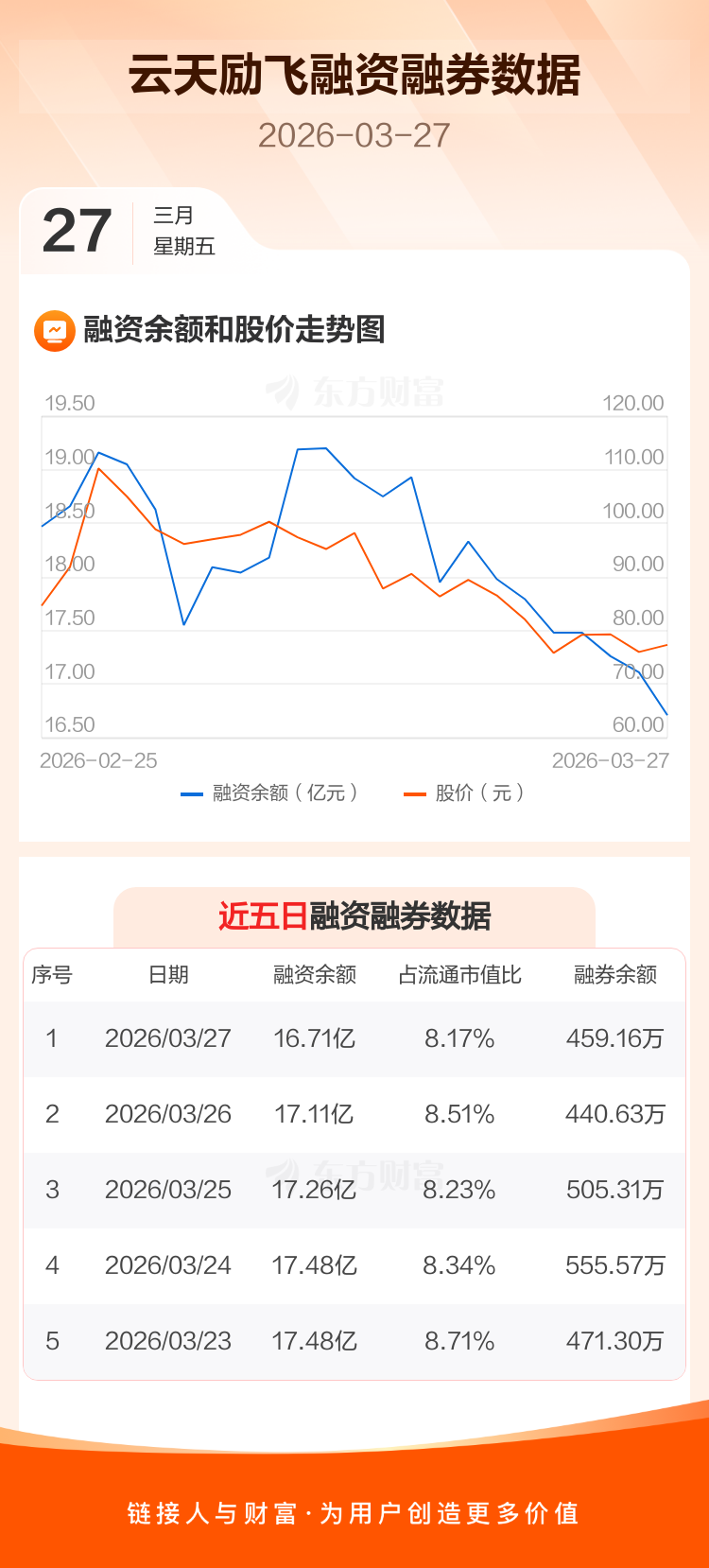 交易所最新数据显示,云天励飞于2026年3月27日获融资买入4181.07万元,融资偿还8097.97万元,当日融资净偿还3916.9万元。目前,该股融资余额16.71亿,占流通市值比例为8.17%。