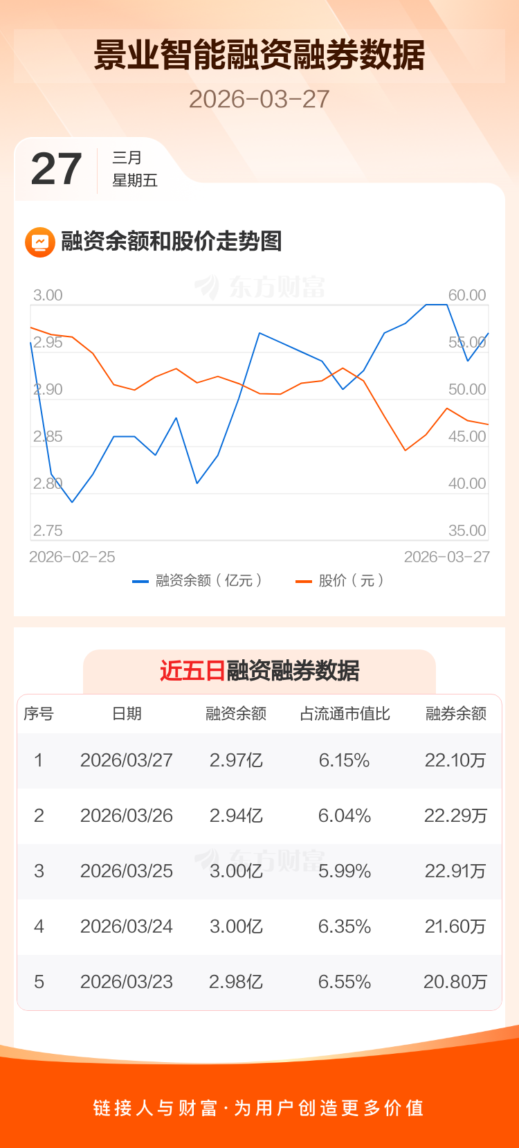 交易所最新数据显示,景业智能于2026年3月27日获融资买入697.05万元,融资偿还432.06万元,当日融资净买入264.99万元。目前,该股融资余额2.97亿,占流通市值比例为6.15%。