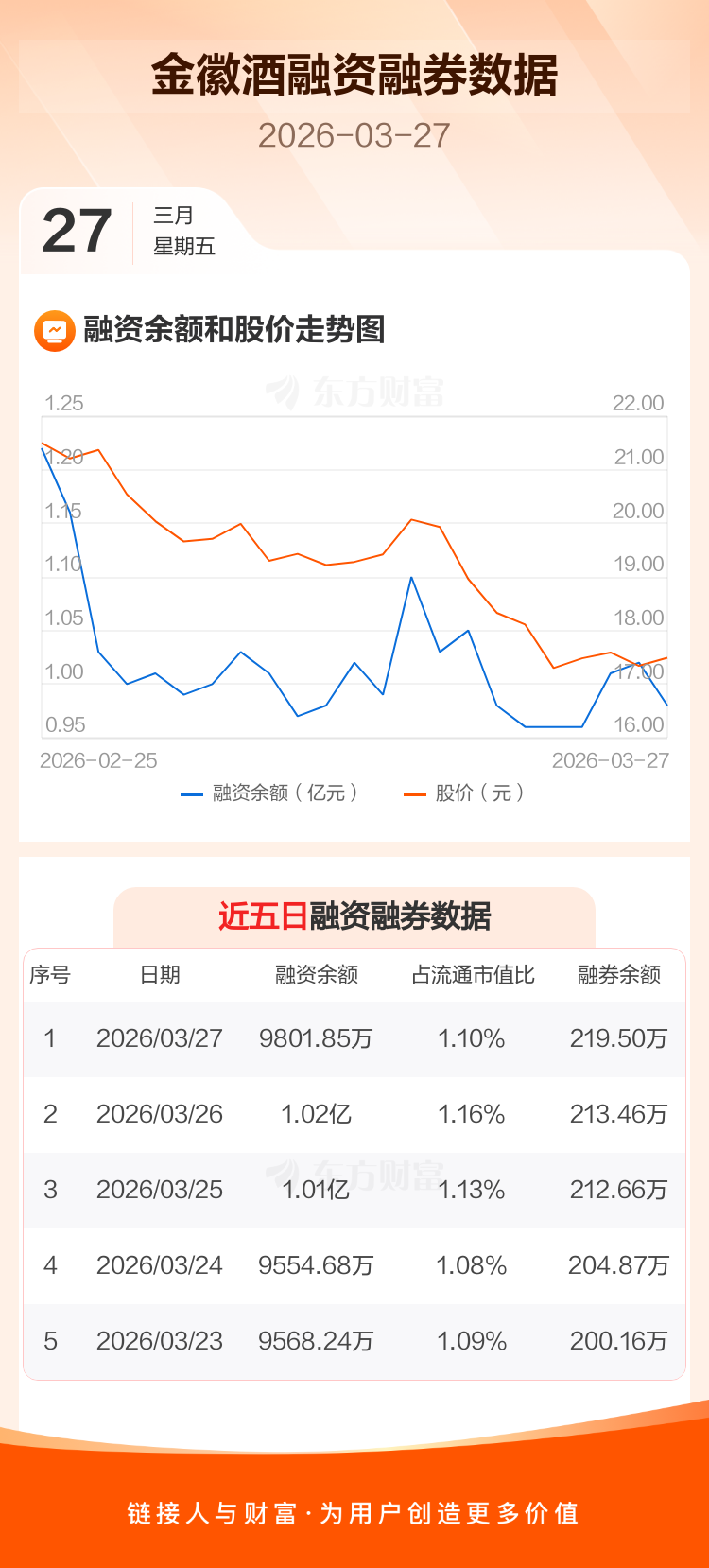 交易所最新数据显示,金徽酒于2026年3月27日获融资买入466.18万元,融资偿还828.68万元,当日融资净偿还362.49万元。目前,该股融资余额9801.85万,占流通市值比例为1.10%。