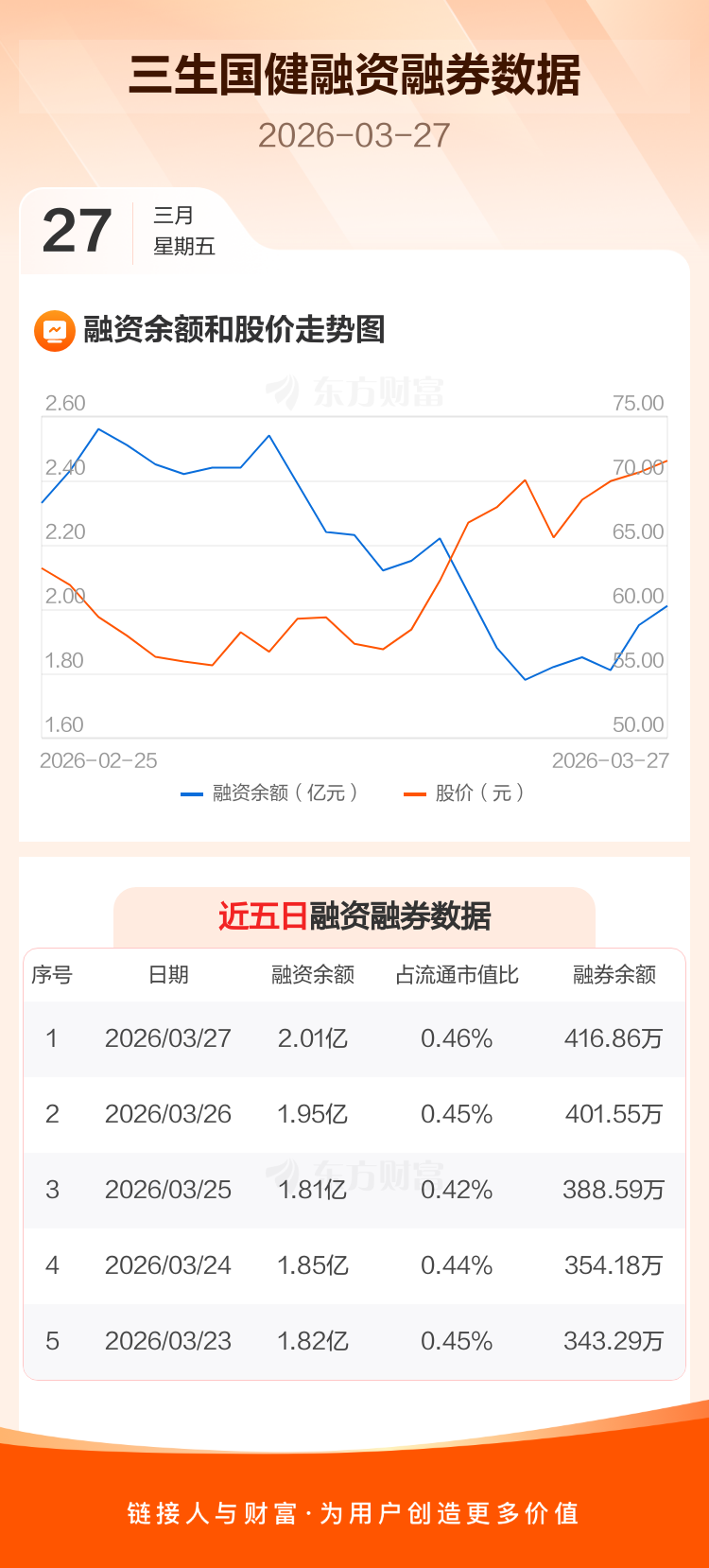 交易所最新数据显示,三生国健于2026年3月27日获融资买入4344.11万元,融资偿还3679.86万元,当日融资净买入664.25万元。目前,该股融资余额2.01亿,占流通市值比例为0.46%。