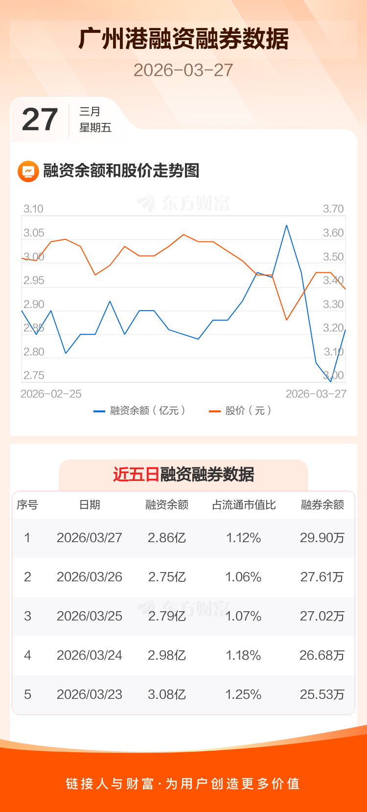 交易所最新数据显示,广州港于2026年3月27日获融资买入2210.62万元,融资偿还1157.09万元,当日融资净买入1053.53万元。目前,该股融资余额2.86亿,占流通市值比例为1.12%。
