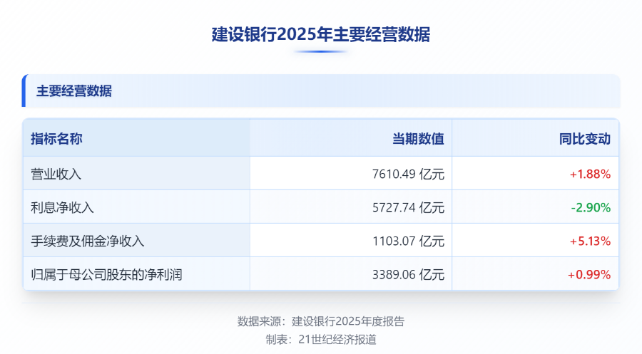 3月27日,建设银行再交出了一份颇具分量的成绩单。数据显示,2025年该行实现营业收入7610.49亿元,同比增长增幅1.88%;净利润3397.90亿元,同比增长1.04%,盈利表现逐季向好。