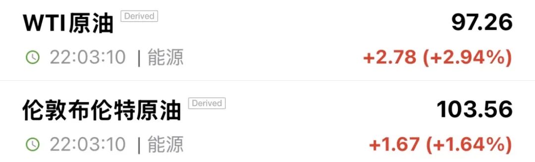 国际油价再度拉升,布伦特原油主力合约涨1.64%,报103.56美元/桶;WTI原油主力合约涨2.94%,报97.26美元/桶。