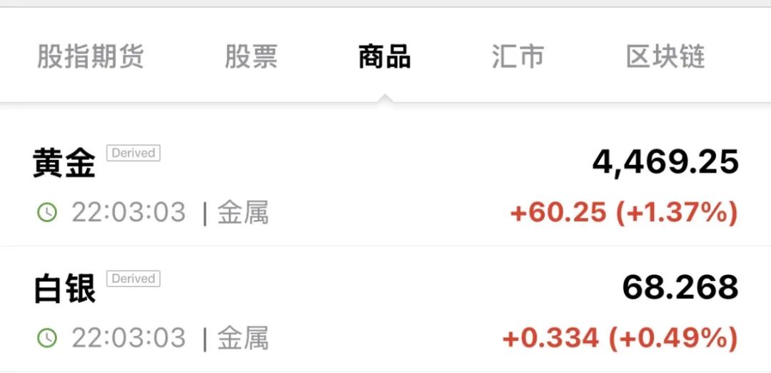 现货黄金涨1.37%,最新报4421美元/盎司。现货白银涨0.49%。