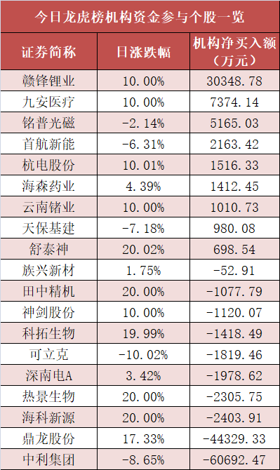 盘后龙虎榜数据显示,机构现身多股,其中赣锋锂业等股票呈现机构资金净买入,中利集团等股票呈现机构资金净卖出。