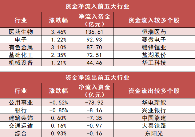 申万一级行业中,26个行业实现资金净流入,其中医药生物行业净流入136.61亿元居首。