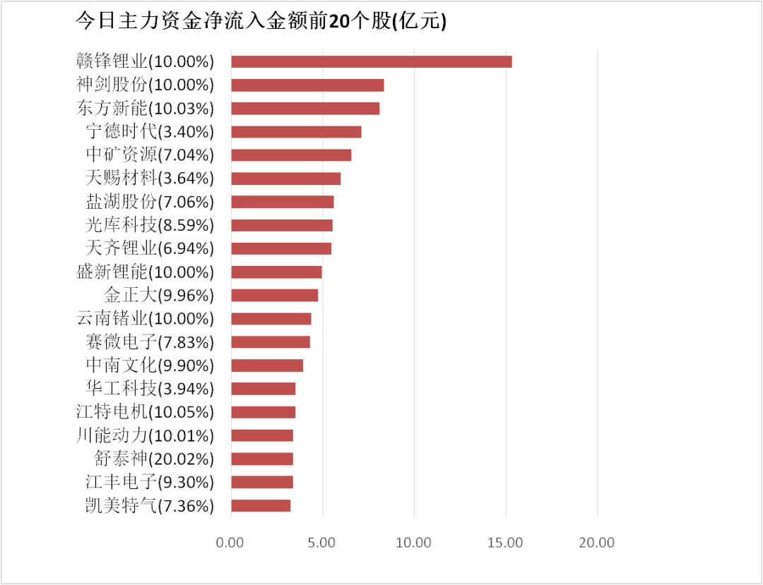 4.赣锋锂业主力资金净流入15.32亿元居首