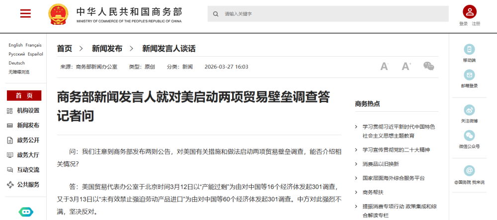 为坚决维护中国相关产业利益,依据《中华人民共和国对外贸易法》和《对外贸易壁垒调查规则》有关规定,针对美对华两起301调查,商务部于3月27日对外发布两则公告,分别就美国破坏全球产供链相关做法和措施、美国阻碍绿色产品贸易相关做法和措施,对等发起两项贸易壁垒调查。