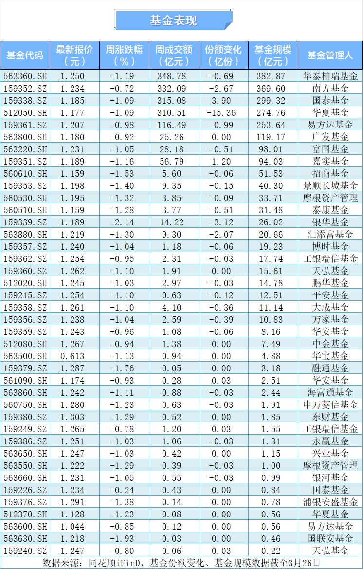 本周中证A500指数下跌1.04%,截至3月27日收盘,报5600.34点。本周日均平均成交额为7746.17亿元,单日成交额环比下降5.97%。