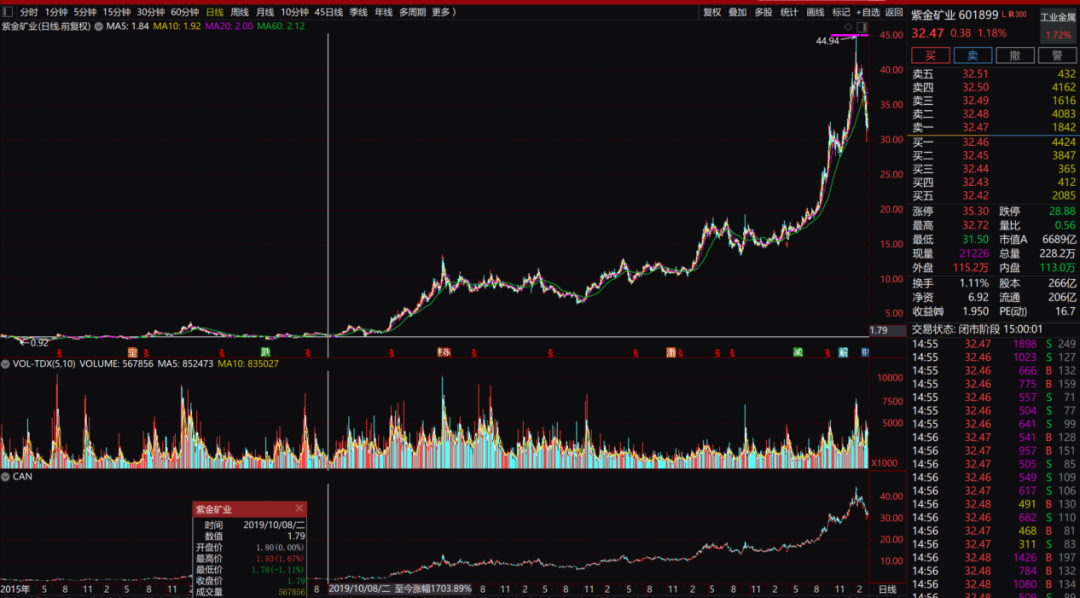 行情软件显示,2019年四季度至今,紫金矿业股价复权涨幅高达1700%。其中,2025年大幅拉升,当年股价复权涨幅高达136%。