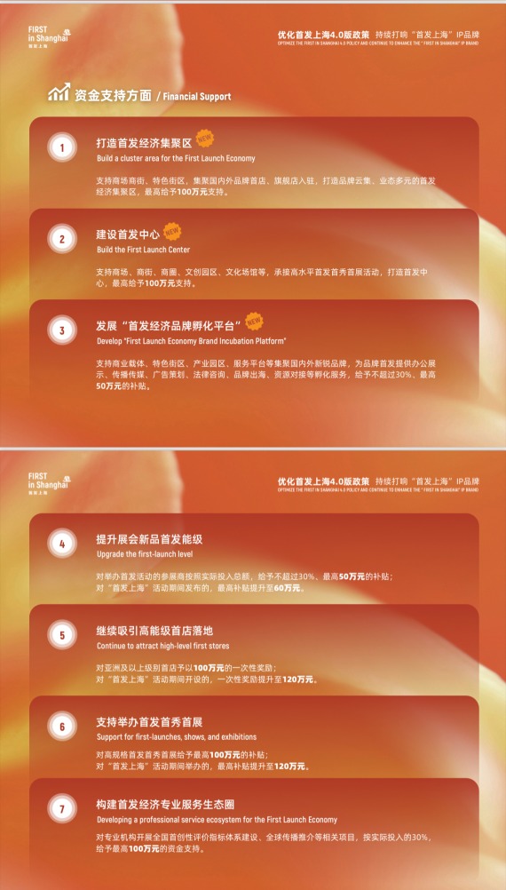资金支持方面,新增对打造首发经济集聚区、首发中心、品牌孵化平台的支持,持续对亚洲及以上首店、高规格首发首秀活动、展会首发和构建专业服务生态圈的支持。其中明确,上海支持商场商街、特色街区集聚国内外品牌首店、旗舰店入驻,打造品牌云集、业态多元的首发经济集聚区,最高给予100万元支持。支持商场、商街、商圈、文创园区、文化场馆等,承接高水平首发首秀首展活动,打造首发中心,最高给予100万元支持。
