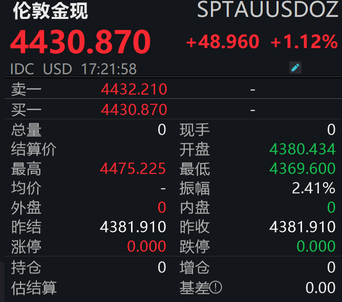 3月27日,截至记者发稿,伦敦金现报4430.87美元/盎司,日内上涨1.12%,盘中最高触及4475.225美元/盎司,最低触及4369.6美元/盎司,多空博弈态势凸显。
