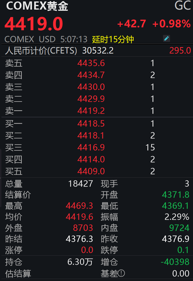 期货市场同步走高。截至记者发稿,COMEX黄金期货日内上涨0.98%,报4419美元/盎司,盘中最高上探至4469.3美元/盎司,最低触及4369.1美元/盎司,与现货市场走势保持联动。