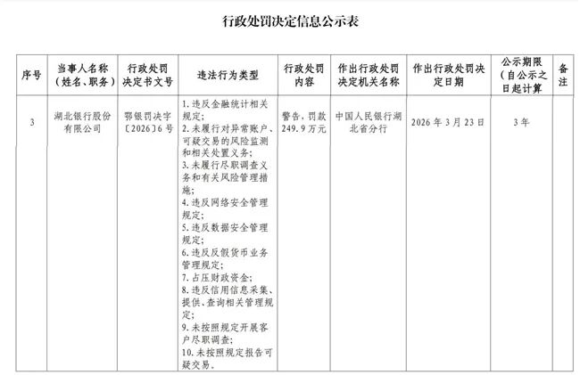 据行政处罚决定信息公示表,湖北银行存在违反金融统计相关规定;未履行对异常账户、可疑交易的风险监测和相关处置义务;未履行尽职调查义务和有关风险管理措施;违反网络安全管理规定;违反数据安全管理规定;违反反假货币业务管理规定;占压财政资金;违反信用信息采集、提供、查询相关管理规定;未按照规定开展客户尽职调查;未按照规定报告可疑交易等10项违法行为,被处以警告,并罚款249.9万元。