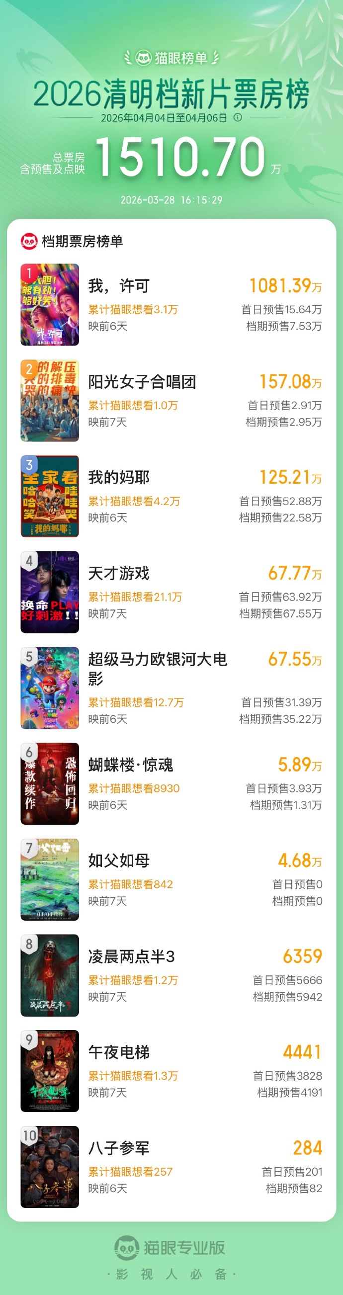 据猫眼专业版数据,截至3月28日16时,2026年清明档新片预售总票房破1500万,《我,许可》《阳光女子合唱团》《我的妈耶》暂列清明档新片预售票房榜前三位。