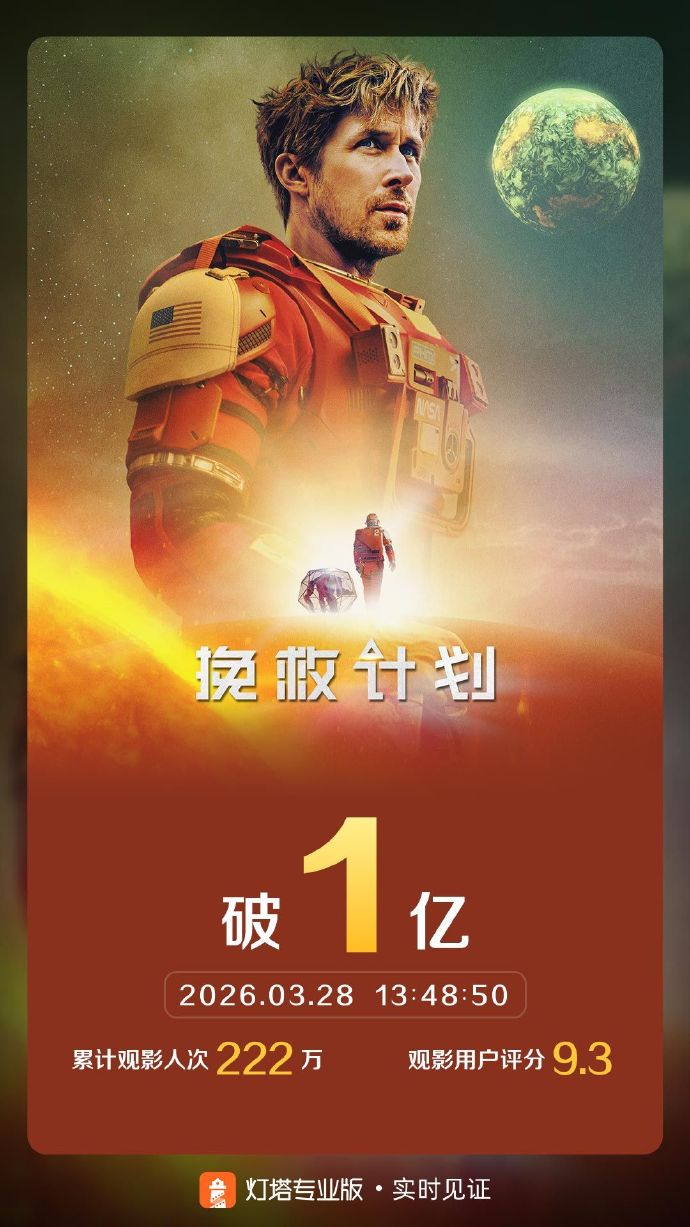 据灯塔专业版实时数据,截至3月28日13时48分,影片《挽救计划》票房突破1亿元。