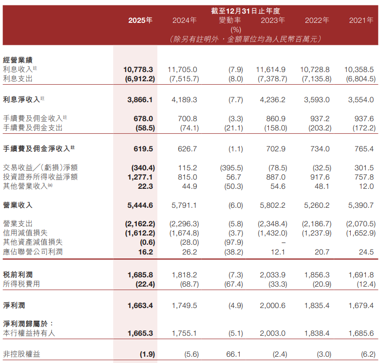 此外,公司2025年手续费及佣金净收入下降。由截至2024年12月31日止年度的人民币6.27亿元减少1.1%至截至2025年12月31日止年度的人民币6.20亿元。手续费及佣金收入下降一是受银行承兑汇票敞口余额下降影响,承兑业务手续费收入下降;二是由于贸易融资业务模式调整,结算及清算手续费收入下降;三是受消费市场影响,银行卡服务手续费收入下降。