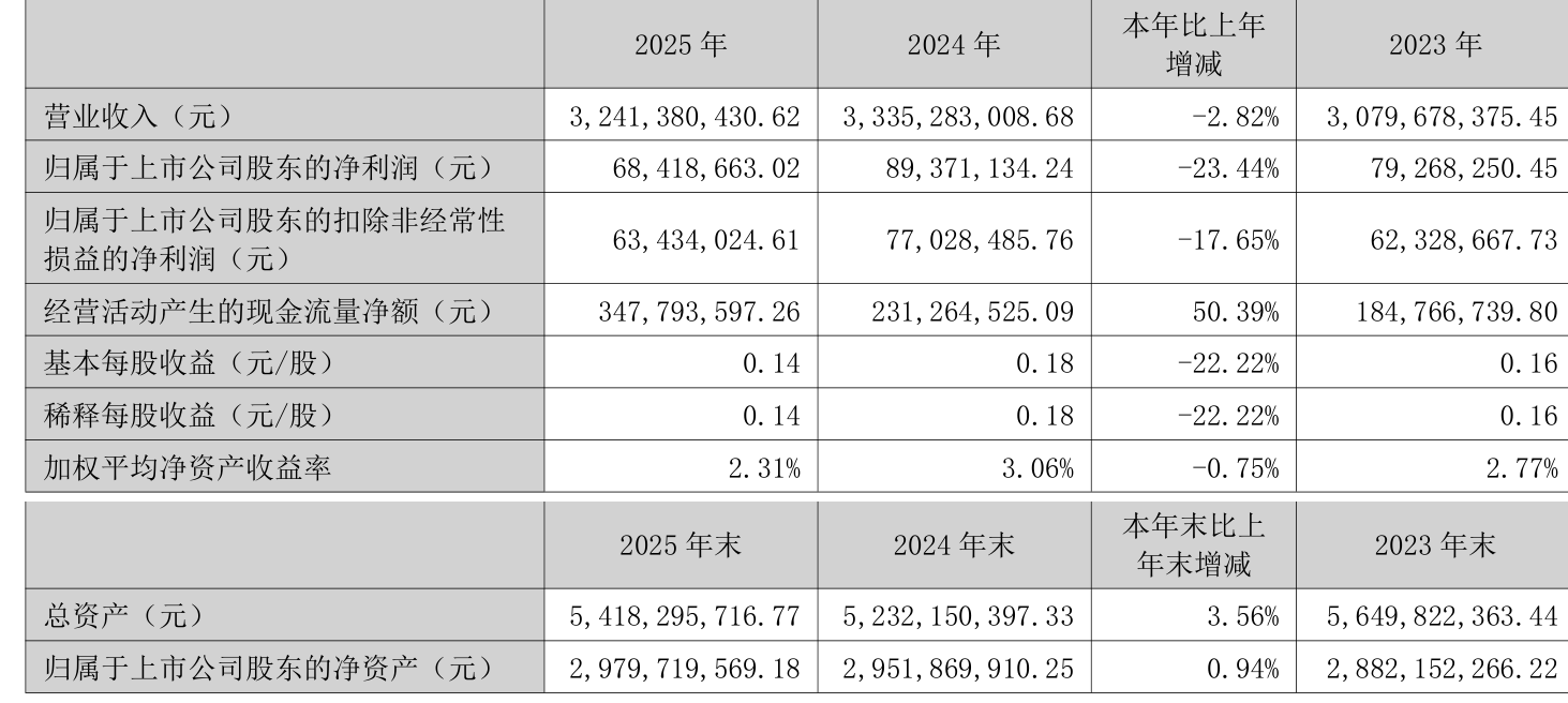 中证智能财讯深纺织A(000045)3月30日披露2025年年度报告。2025年,公司实现营业总收入32.41亿元,同比下降2.82%;归母净利润6841.87万元,同比下降23.44%;扣非净利润6343.4万元,同比下降17.65%;经营活动产生的现金流量净额为3.48亿元,同比增长50.39%;报告期内,深纺织A基本每股收益为0.14元,加权平均净资产收益率为2.31%。公司2025年度分配预案为:拟向全体股东每10股派现0.48元(含税)。