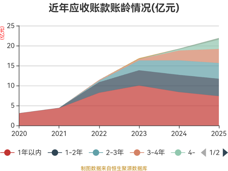 从应收账款账龄结构来看,截至2025年末,公司账龄在1年以内的应收账款余额为7.35亿元,较上年末下降1.02亿元,占应收账款总额比例为33.52%,较上年末下降9.99个百分点。