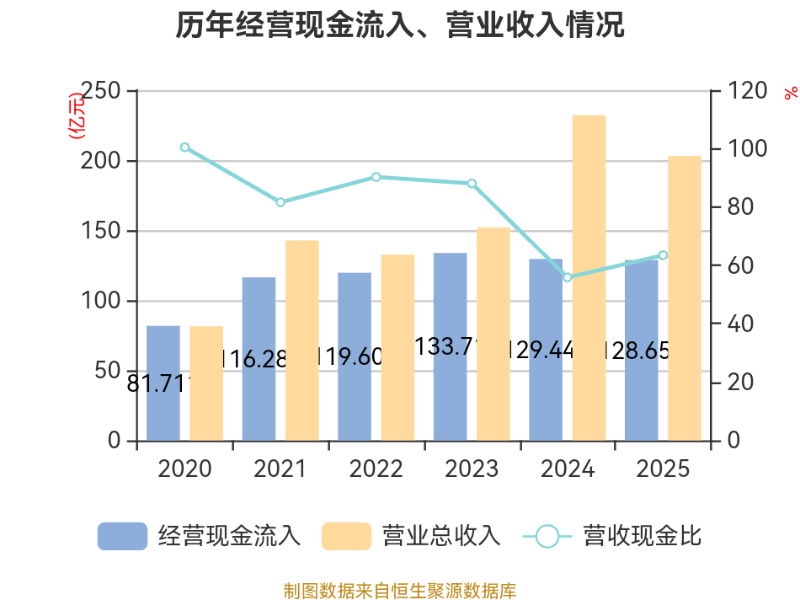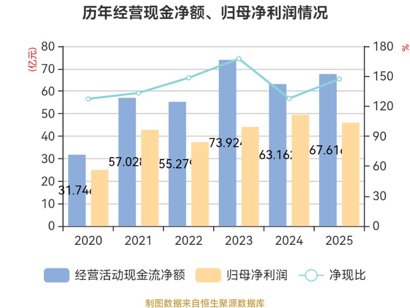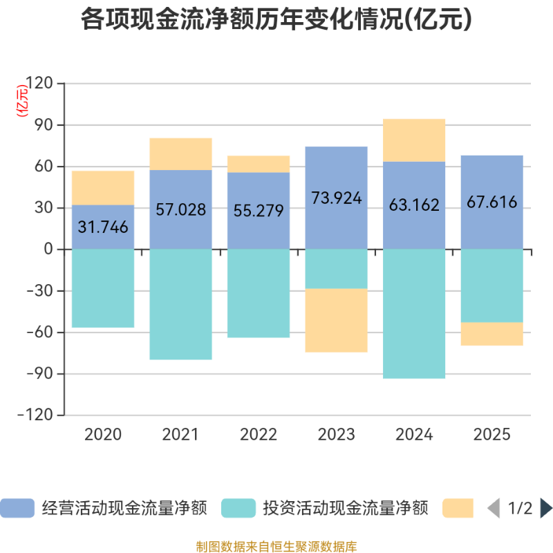 截至2025年,公司经营活动现金流净额为67.62亿元,同比增长7.05%;筹资活动现金流净额-16.78亿元,同比减少47.59亿元;投资活动现金流净额-53.22亿元,上年同期为-93.88亿元。