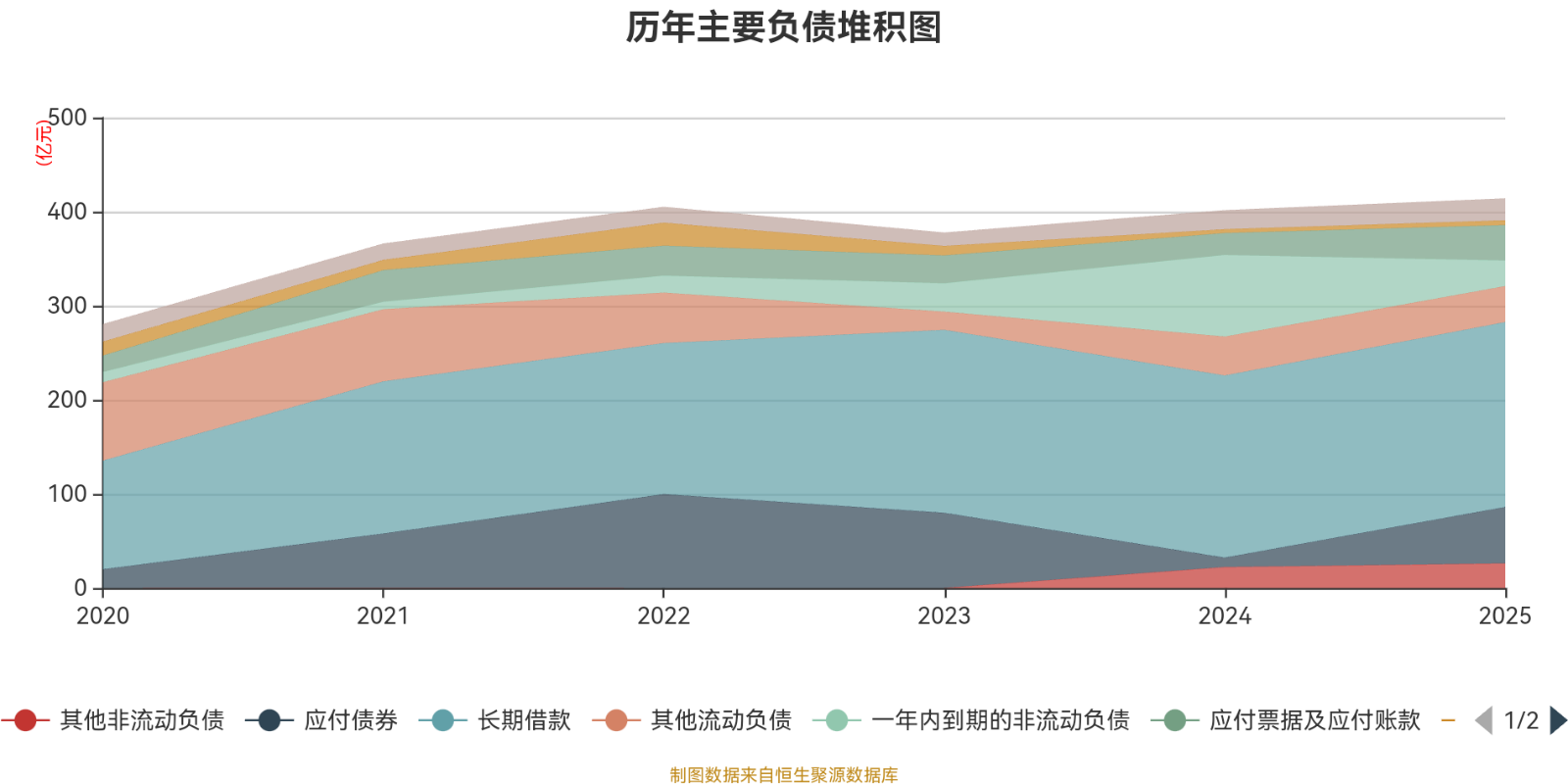 负债重大变化方面,截至2025年末,公司一年内到期的非流动负债较上年末减少68.53%,占公司总资产比重下降6.83个百分点;应付债券较上年末增加499.94%,占公司总资产比重上升5.11个百分点;应付票据及应付账款较上年末增加62.23%,占公司总资产比重上升1.32个百分点;长期借款较上年末增加1.52%,占公司总资产比重下降1.15个百分点。