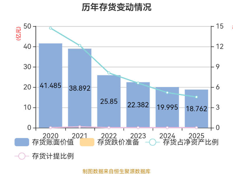 从存货变动来看,截至2025年末,公司存货账面价值为18.76亿元,占净资产的4.53%,较上年末减少1.23亿元。公司本期没有计提存货跌价准备。