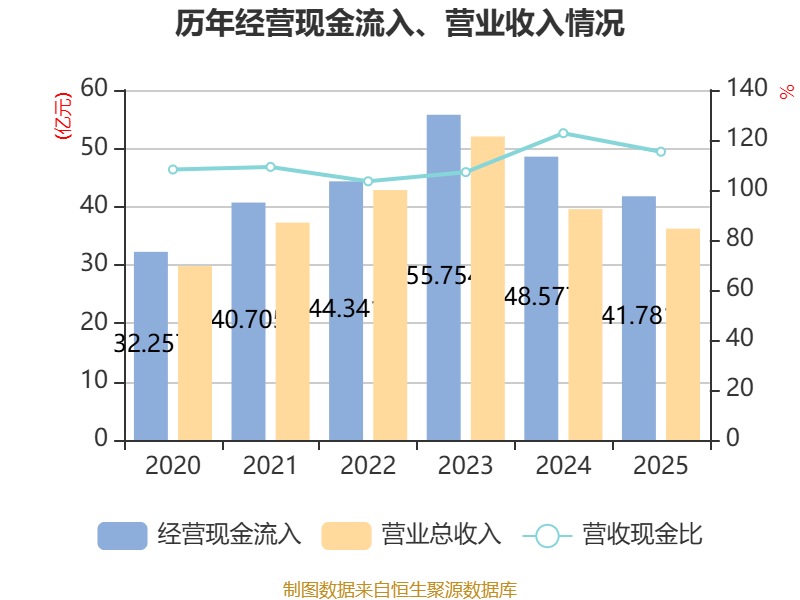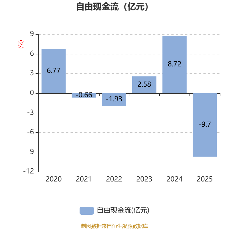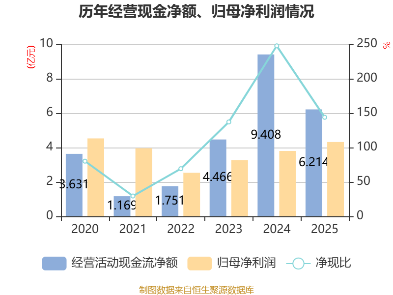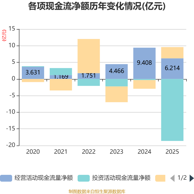 截至2025年,公司经营活动现金流净额为6.21亿元,同比下降33.95%;筹资活动现金流净额3.37亿元,同比增加5.98亿元;投资活动现金流净额-18.62亿元,上年同期为-3311.4万元。