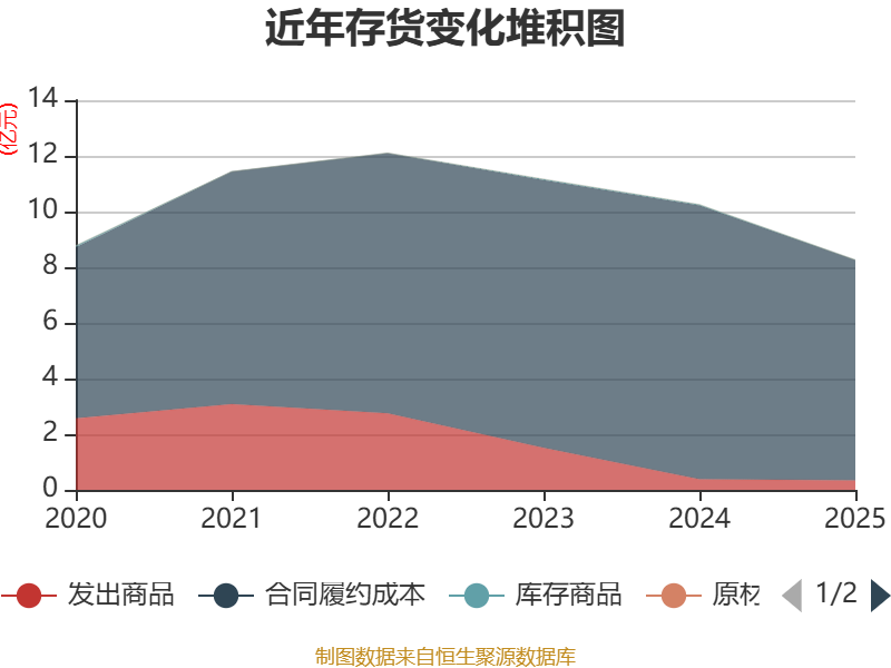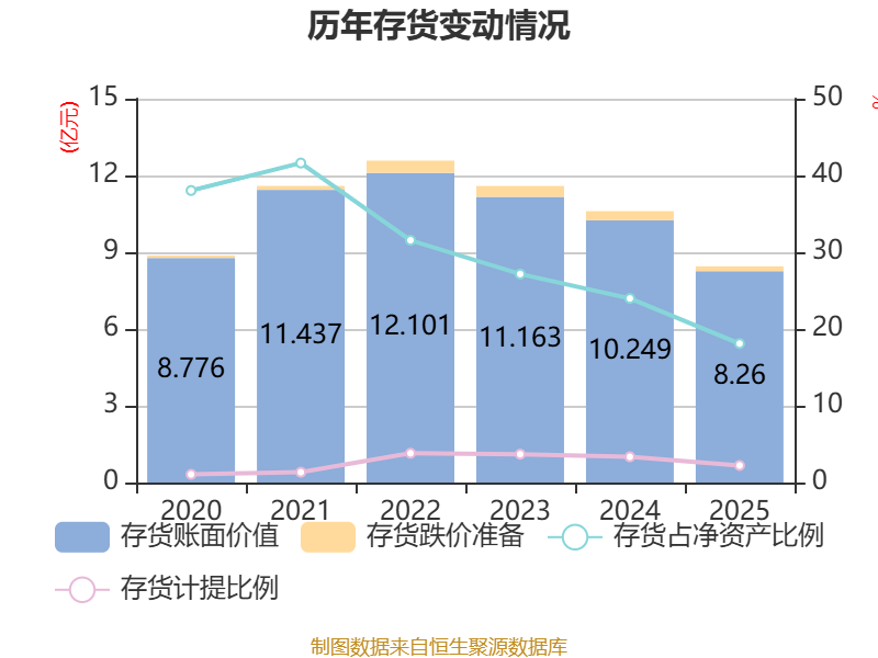 从存货变动来看,截至2025年末,公司存货账面价值为8.26亿元,占净资产的18.1%,较上年末减少1.99亿元。其中,存货跌价准备为1875.06万元,计提比例为2.22%。