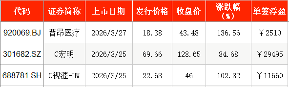 3月27日,普昂医疗(920069)在北交所挂牌上市,发行价为18.38元/股,截至上市首日收盘,该股报43.48元/股,涨幅为136.56%。以收盘价计算,投资者中一签浮盈为2510元。