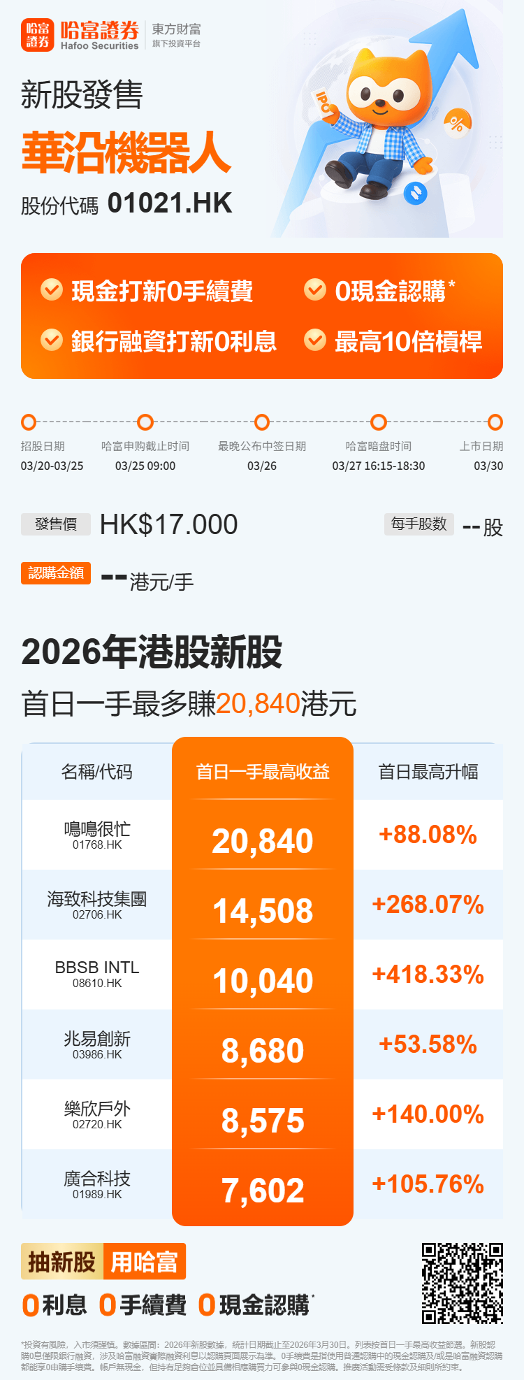 华沿机器人(01021)公布 IPO 配发结果,公司最终全球发售 9290.26 万股 H 股,其中香港公开发售占比 17.4%,国际发售占 82.6%,最终发售价定为每股 17 港元,全球发售净筹约 14.78 亿港元,股份每手 200 股,预期于 2026 年 3 月 30 日上午九时正在联交所挂牌交易。