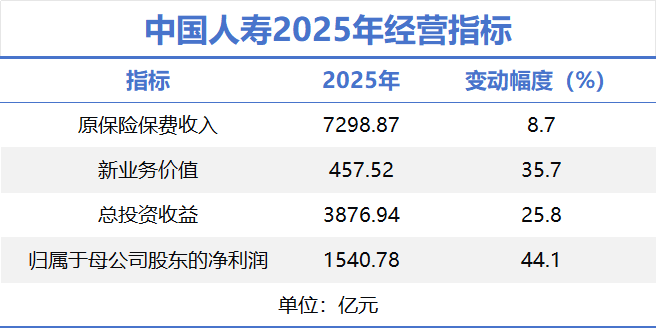 数据显示,2025年中国人寿总保费收入7298.87亿元,同比增长8.7%,首次突破7000亿元;归属于母公司股东的净利润1540.78亿元,同比增长44.1%;内含价值1.47万亿元,稳居行业首位。